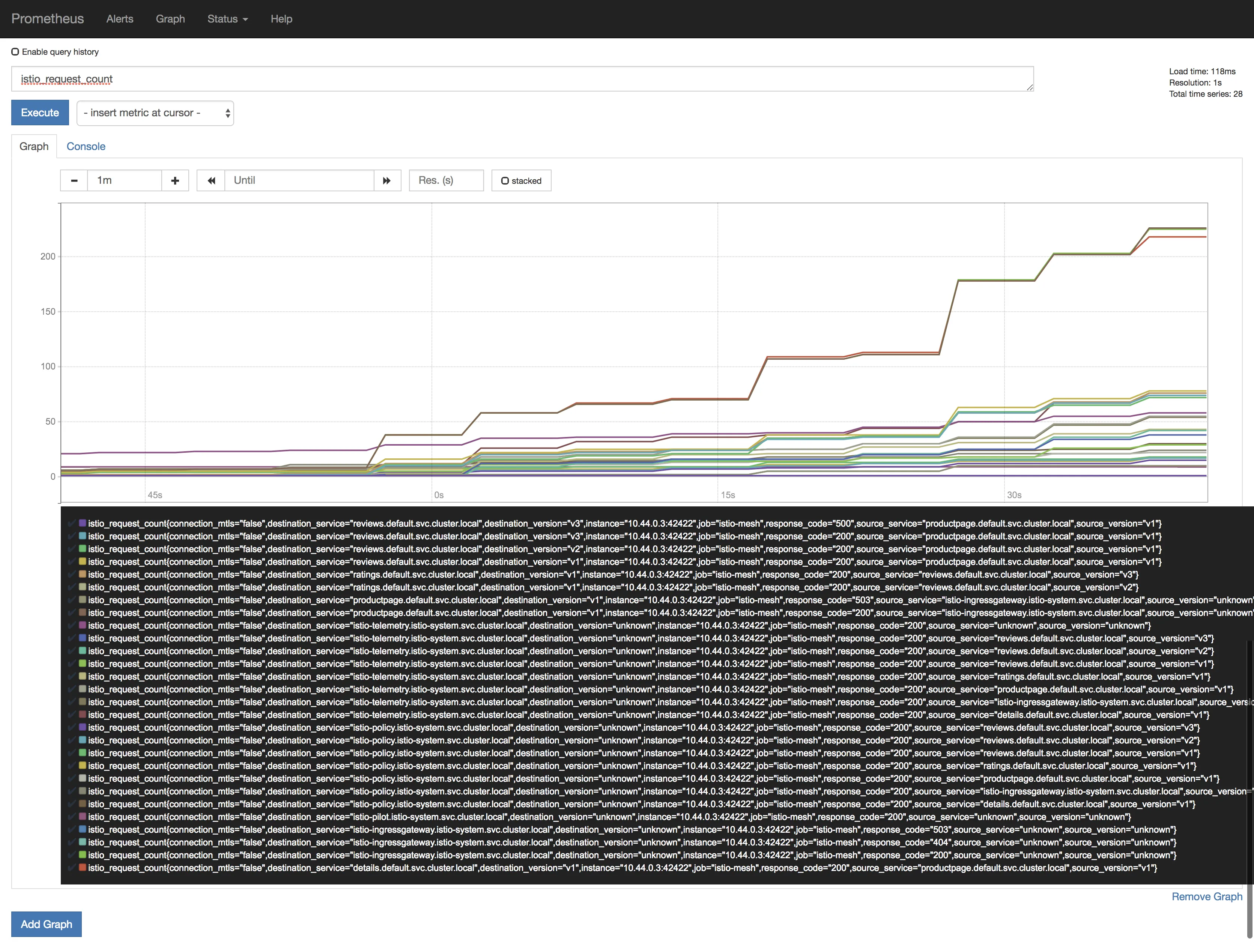Browse to http://<ip>:<port> and in the Expression input box enter: istio_request_bytes_count. Click the Execute button.